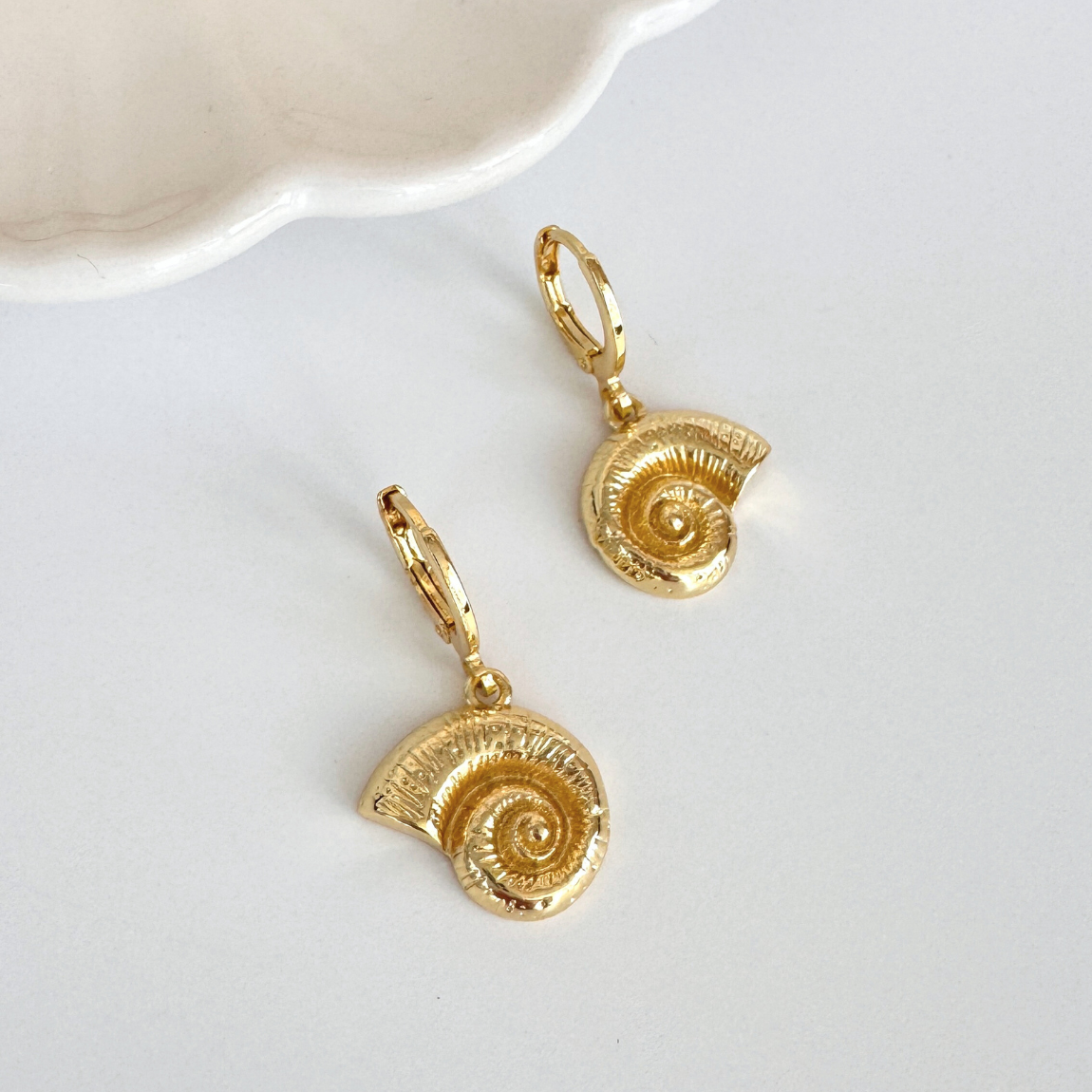 Aros colgantes con diseño de caracola, enchapados en oro 18K. Un detalle elegante y luminoso, inspirado en el mar.