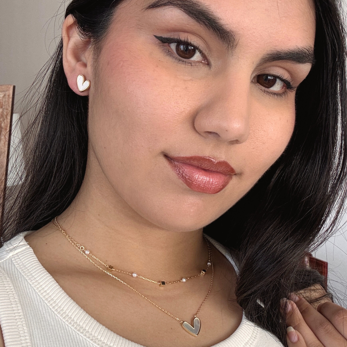 Los Aros Corazón de Nácar destacan por su diseño simple y sofisticado, combinando la suavidad del nácar con un delicado marco dorado enchapado en oro 18K. Su brillo natural refleja la luz de forma sutil, aportando frescura y elegancia al rostro.