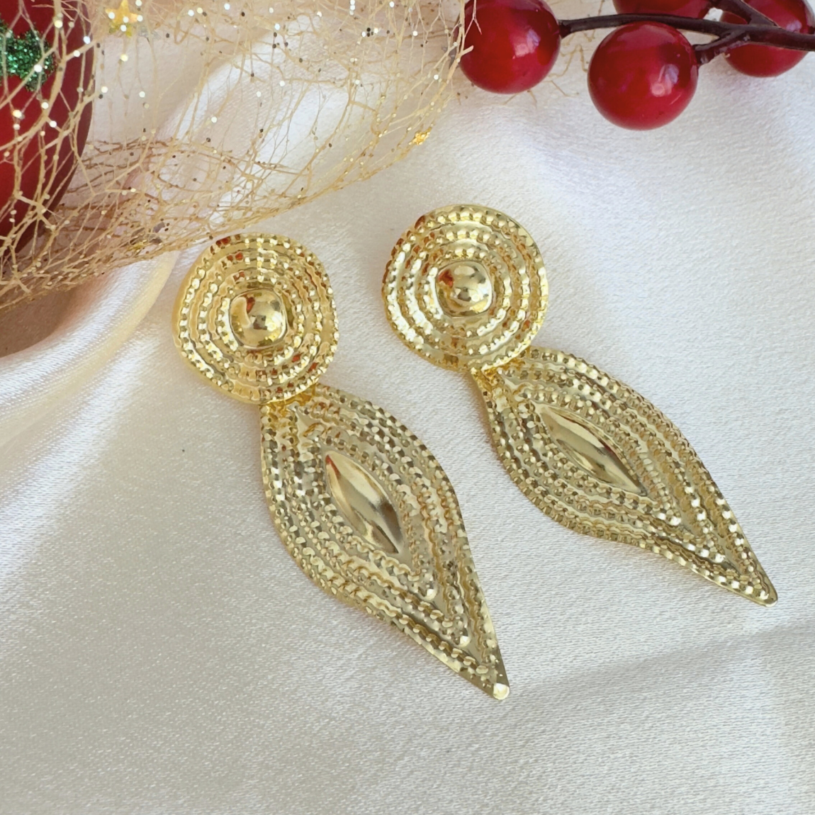 Aros dorados largos de 6 cm con diseño de disco texturado y hoja tallada. Brillantes, livianos y perfectos para looks elegantes.