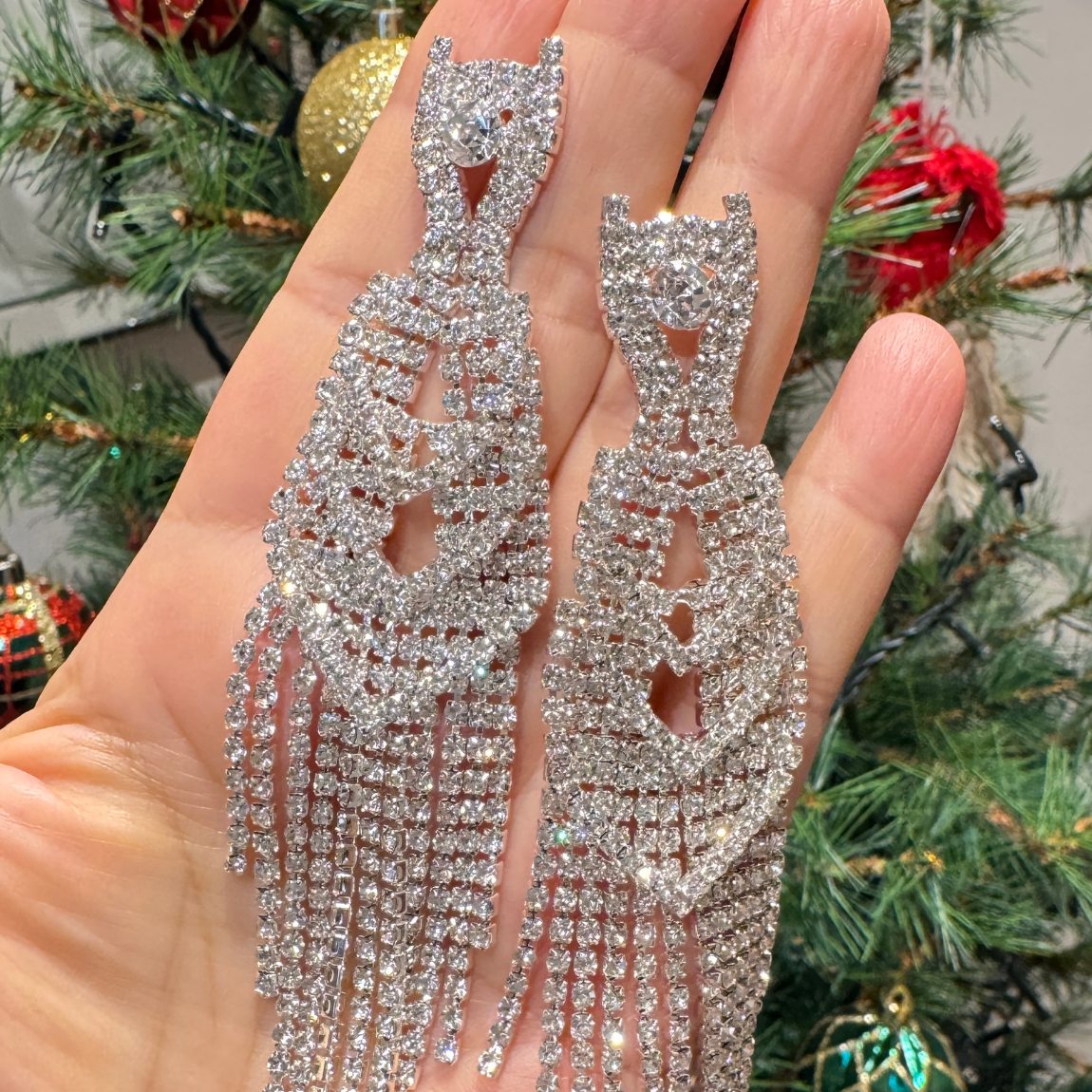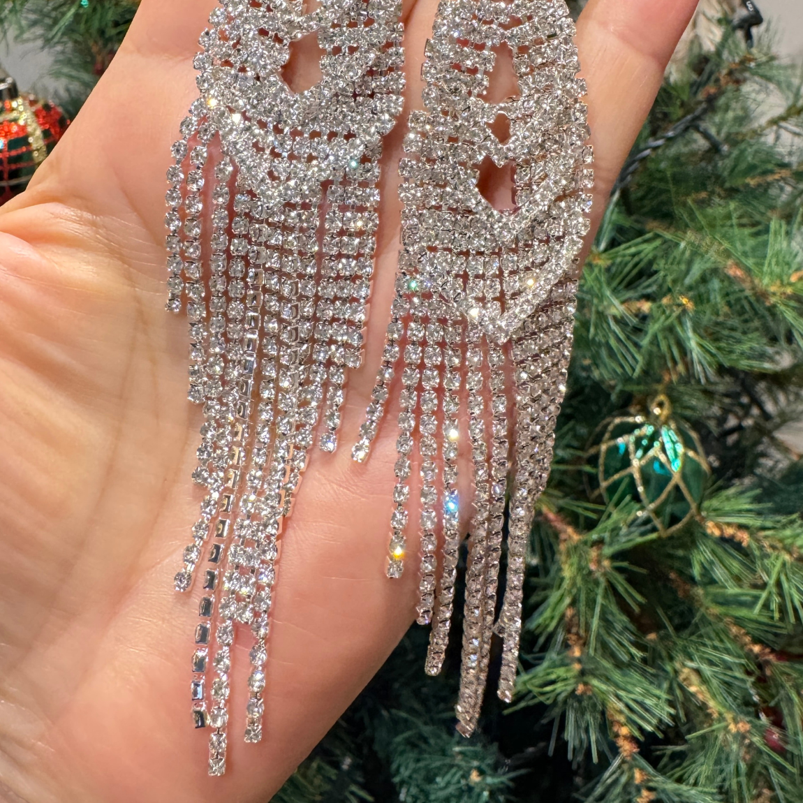 Aros largos con flecos de cristales brillantes, diseñados para un look glamoroso y con alto impacto visual.