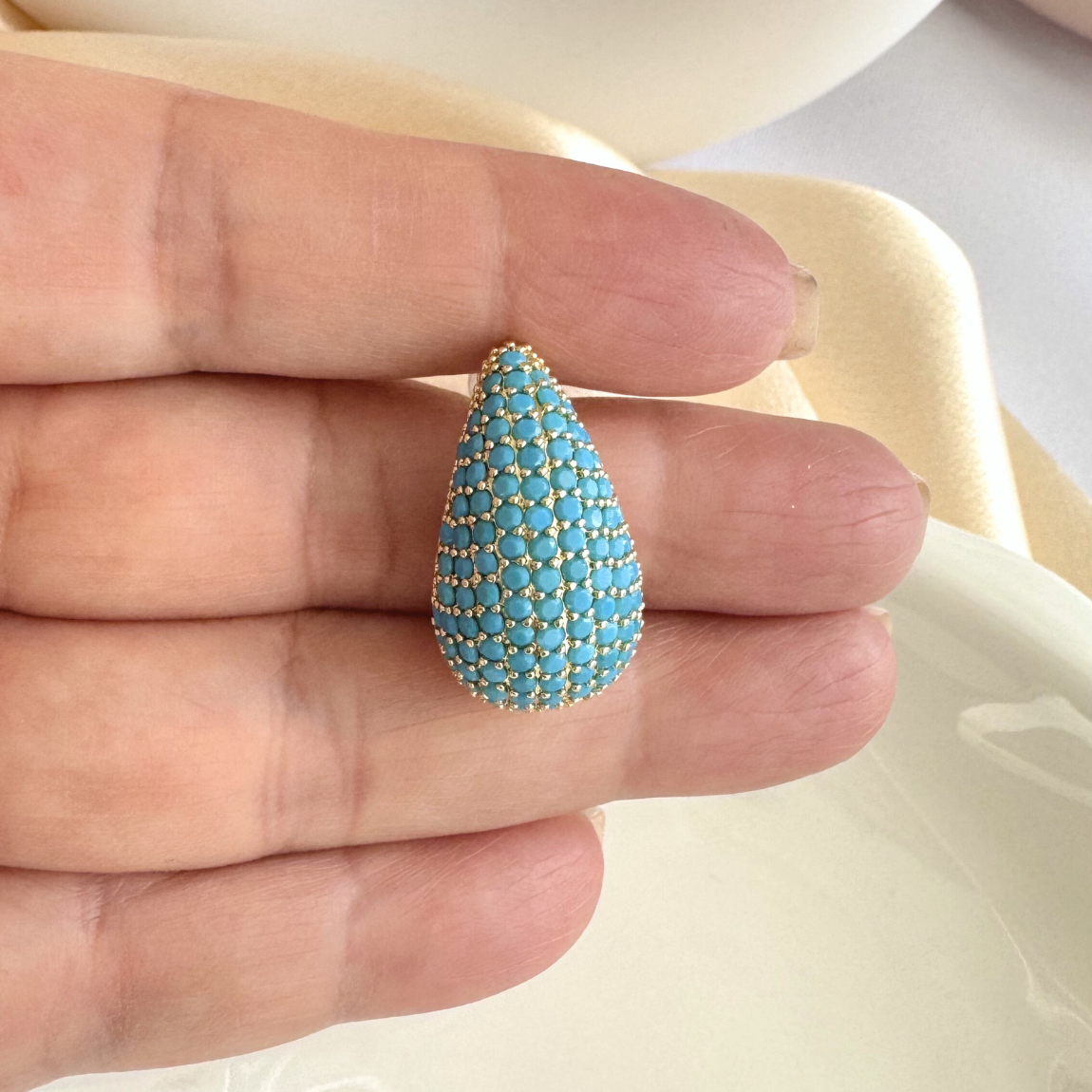 Su forma de gota estiliza el rostro, mientras los circones en tono calipso aportan luminosidad y un contraste vibrante con el acabado dorado. Son ideales para eventos, celebraciones o para elevar un look neutro con un toque de color y carácter.