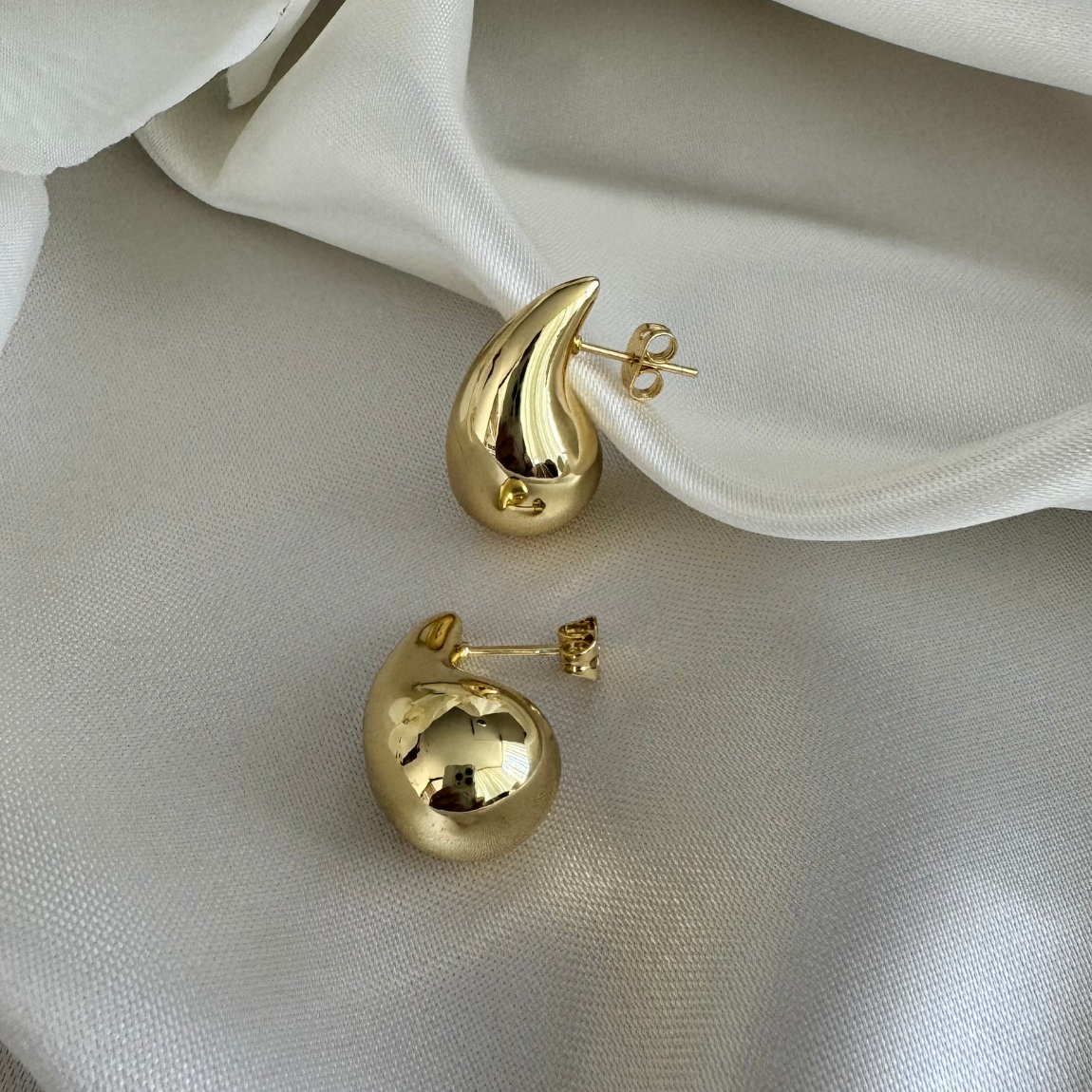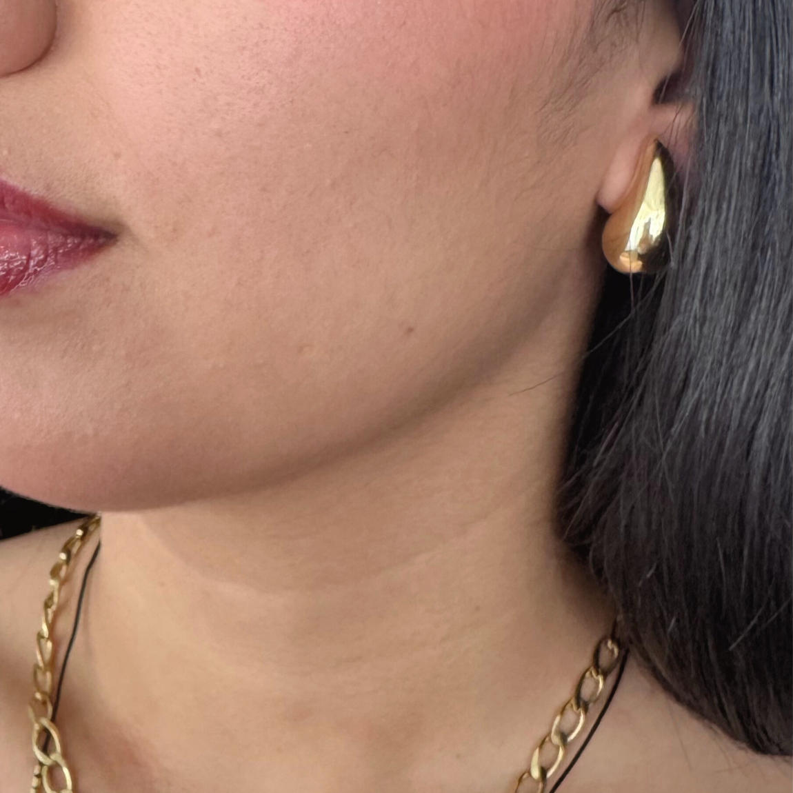 Aros Gota Mediana enchapados en oro 18k. Su diseño curvo y pulido crea un efecto luminoso que realza cualquier look, desde lo más simple hasta lo más sofisticado.