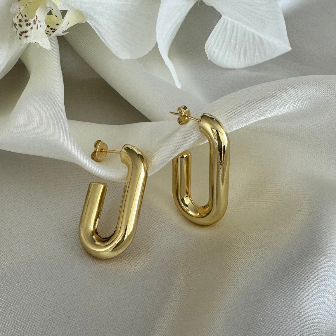 Estos aros rectangulares enchapados en oro 18k destacan por su forma estilizada y su brillo pulido, perfectos para elevar cualquier look con un toque sofisticado. Ligeros, versátiles y pensados para acompañarte en cada ocasión.